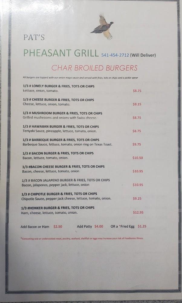 Welcome to Pat's Pheasant Grill, your go-to spot for delicious American cuisine in Arlington, Oregon! Nestled at 300 Locust St, we offer a delightful menu that caters to every meal of the day, including hearty breakfasts, scrumptious burgers, and tempting desserts. Enjoy our cozy atmosphere with family-friendly amenities like high chairs and a kid's menu, as well as outdoor seating and convenient drive-thru service. Our commitment to quality shines through in every dish, from our mouthwatering milkshakes to our savory patty melts. Join us for an unforgettable dining experience where great taste meets exceptional service!